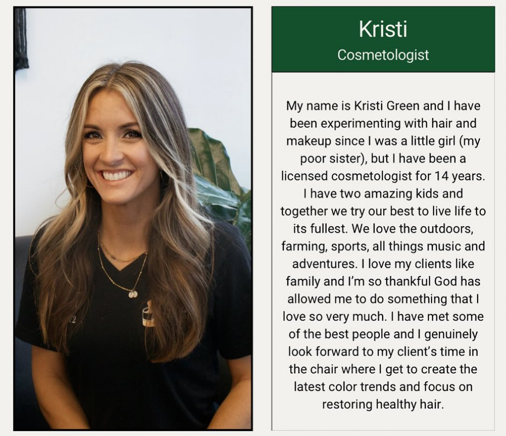 My name is Kristi Green and I have been a licensed cosmetologist since 2011. I absolutely love my clients and spending time with them in my chair. I am always looking to expand my craft and create beautiful results for my clients.
