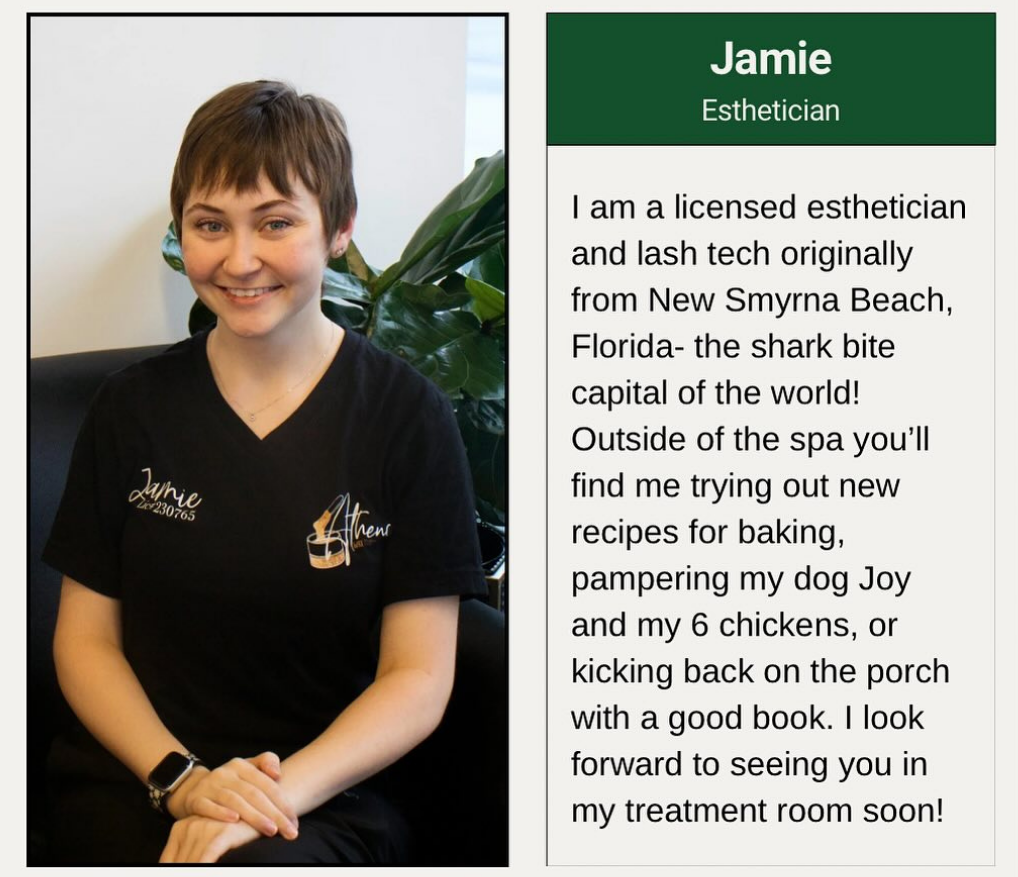 Hello! I’m Jamie, and I’m a licensed esthetician. I’ve lived in Tennessee for a few years now but I’m originally from New Smyrna Beach, Florida (which is the shark bite capitol of the world-I’m glad to be in the mountains now!). When I’m not in the spa I’m either reading, exploring Athens, or binge watching something with my dog Joy on my lap. I have a passion for skincare and a love for lash extensions- come book with me for both!