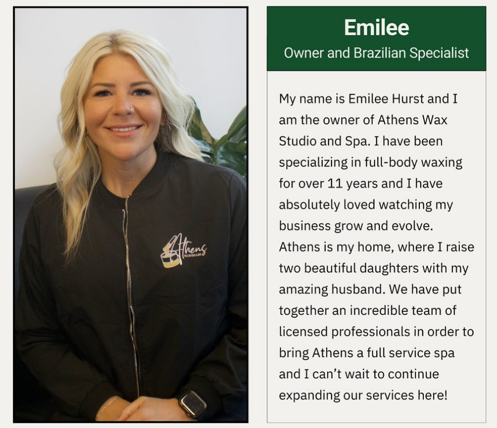 With a passion for refined beauty and meticulous detail, Emilee is the visionary behind Athens Wax Studio & Spa, where artistry meets elegance. Specializing in advanced waxing and permanent makeup, she is known for her precision, gentle technique, and commitment to enhancing each client’s natural features with subtle sophistication.